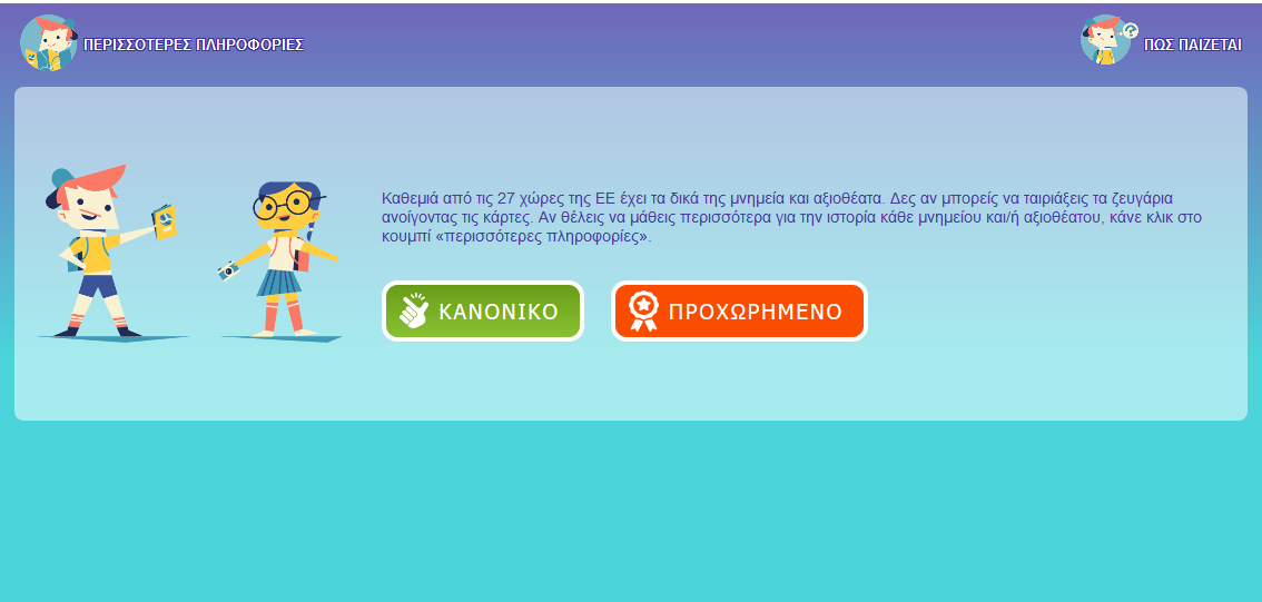 Καθεμιά από τις 27 χώρες της ΕΕ έχει τα δικά της μνημεία και αξιοθέατα. Δες αν μπορείς να ταιριάξεις τα ζευγάρια ανοίγοντας τις κάρτες. Αν θέλεις να μάθεις περισσότερα για την ιστορία κάθε μνημείου και/ή αξιοθέατου, κάνε κλικ στο κουμπί «περισσότερες πληροφορίες»!