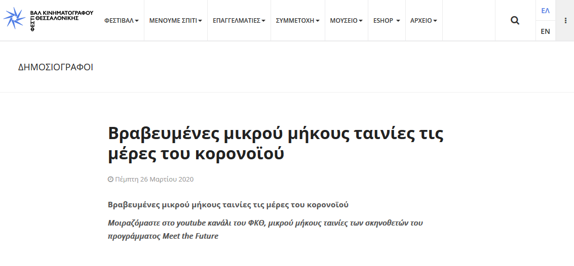 Λατρεύετε την έβδομη τέχνη και δη ταινίες μικρού μήκους; Δείτε βραβευμένες ταινίες του  project «Meet the Future» του  60ού Φεστιβάλ από το Φεστιβάλ Κινηματογράφου Θεσσαλονίκης σε συνεργασία με το ίδρυμα Ωνάση.