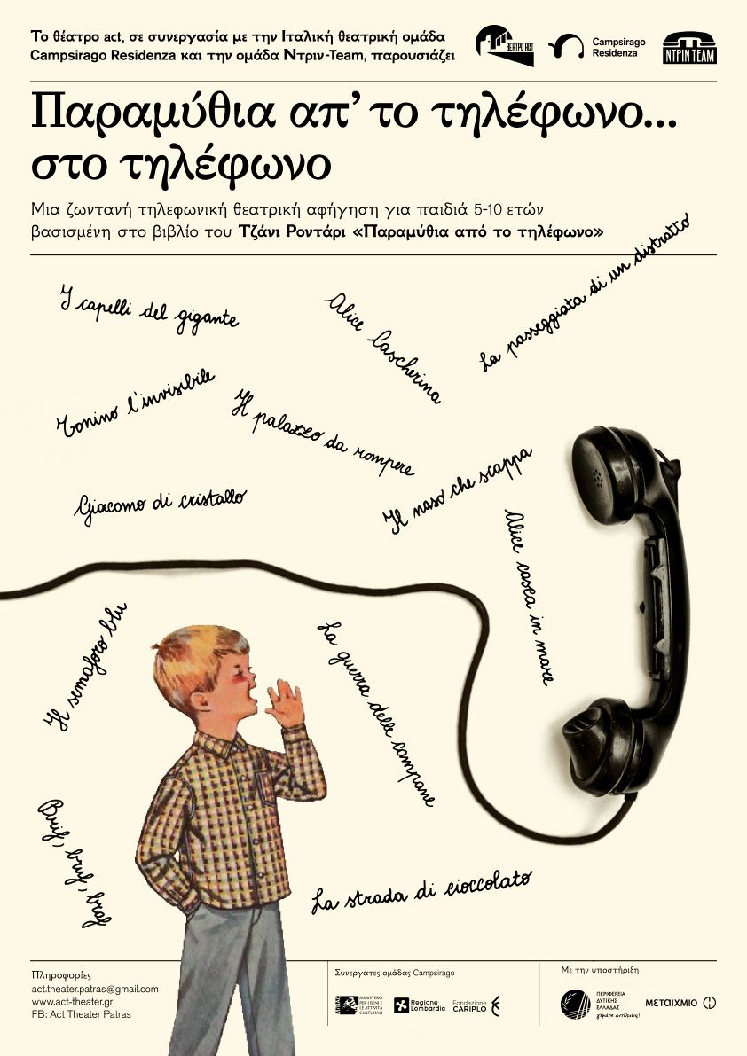 Το θέατρο act με την υποστήριξη της Περιφέρειας Δυτικής Ελλάδας και σε συνεργασία με την ιταλική θεατρική ομάδα Campsirago Residenza από τη Λομβαρδία και τη νεοσύστατη ελληνική ομάδα τηλεφωνικών αφηγήσεων ΝτρινTeam, φέρνει στην Ελλάδα και στην ελληνική γλώσσα τις τηλεφωνικές θεατρικές αφηγήσεις για τα παιδιά που μένουν σπίτι. Σε αυτήν την ιστορική στιγμή, όπου τα παιδιά δεν μπορούν να πάνε ούτε στο σχολείο, ούτε στο θέατρο ούτε στις βιβλιοθήκες, το θέατρο έρχεται στο σπίτι τους μέσα από ένα διαδραστικό τηλεφώνημα και τη ζωντανή φωνή ενός/μιας ηθοποιού.